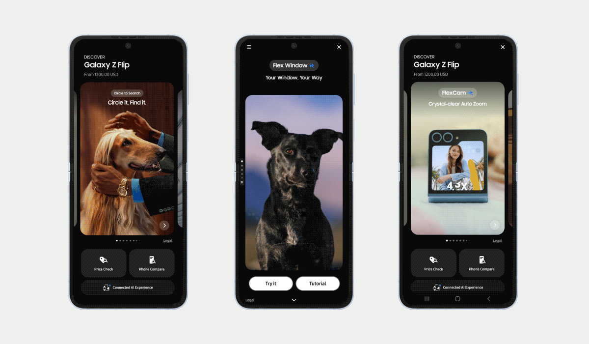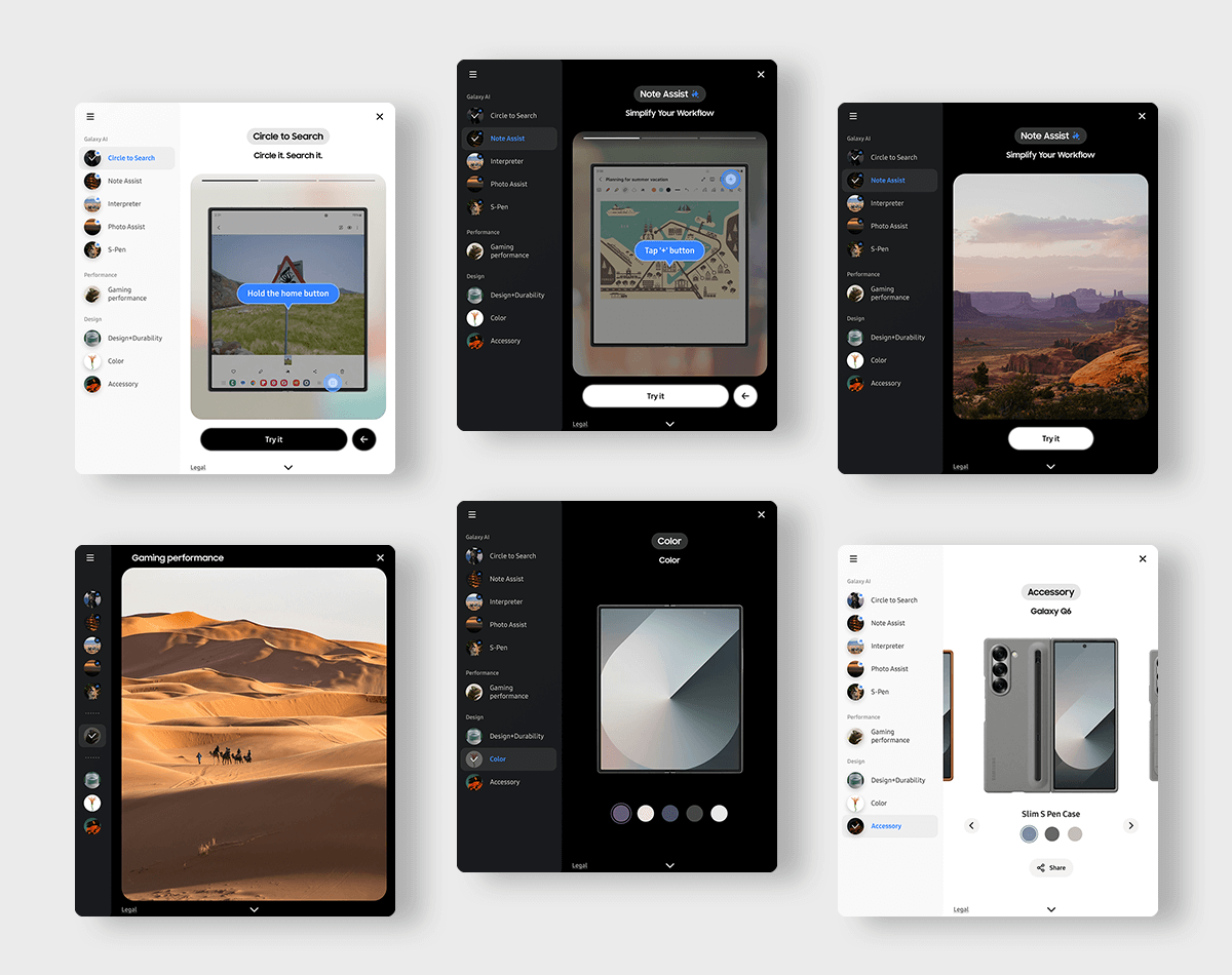사용자는 화면을 통해 각 Galaxy의 주요 기능을 영상 및 Try it 기능으로 체험해 볼 수 있으며, 가격 확인 및 기간 스펙 비교, AI 기능이 포함된 Galaxy Wearable App으로의 이동 등의 체험도 가능하다.