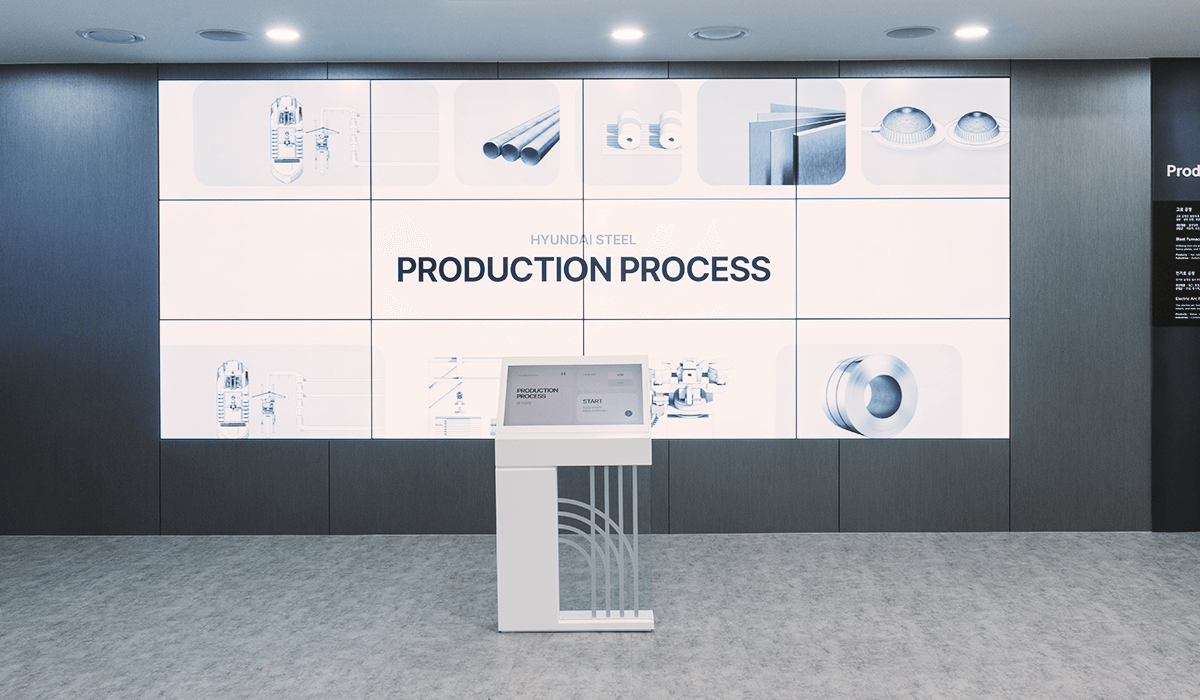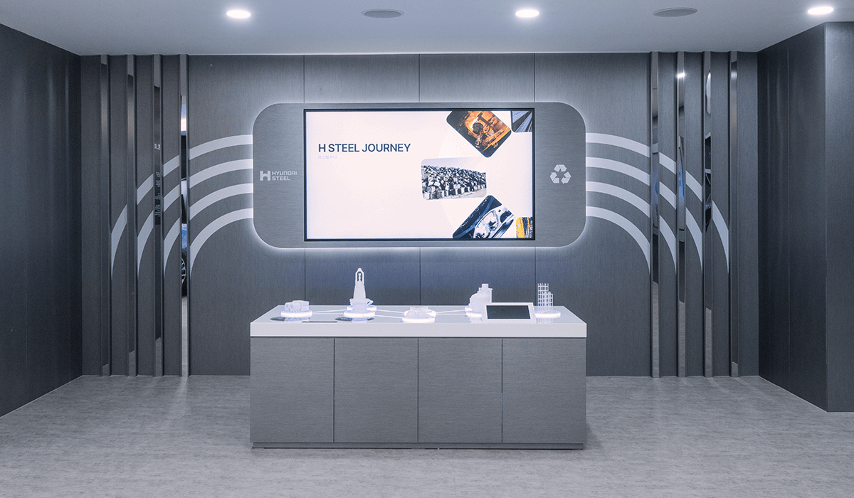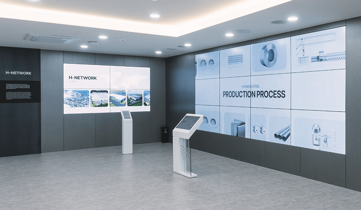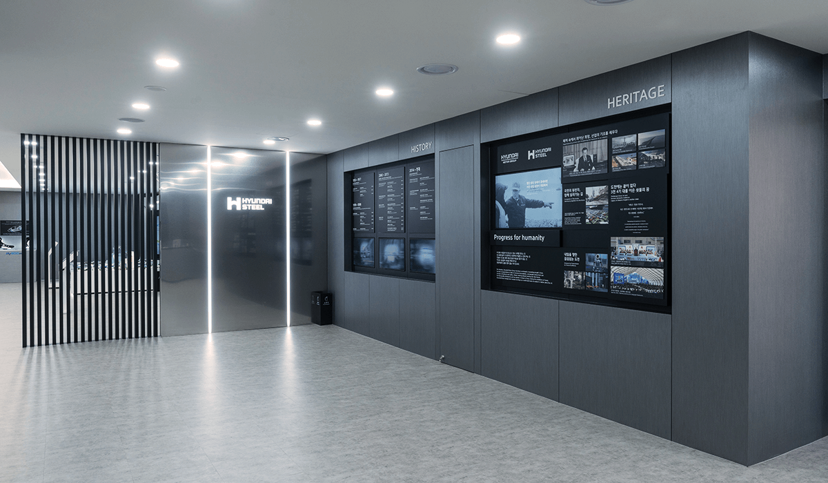 현대제철 전시관의 전체 공간 기획과 시스템 설계 및 컨텐츠 제작을 담당하였다. 입구 LED에서는 웰컴 메세지 및 방문객 환영 인사 등의 개별 메세지를 담을 수 있는 컨텐츠를 노출하고있고, 내부의 로비 LED에서는 철을 사각형 모티프로 형상화하여 끊임없이 변화하고 무한한 가능성을 담았다는 내용을 담은 현대제철 Identity 영상이 재생된다.