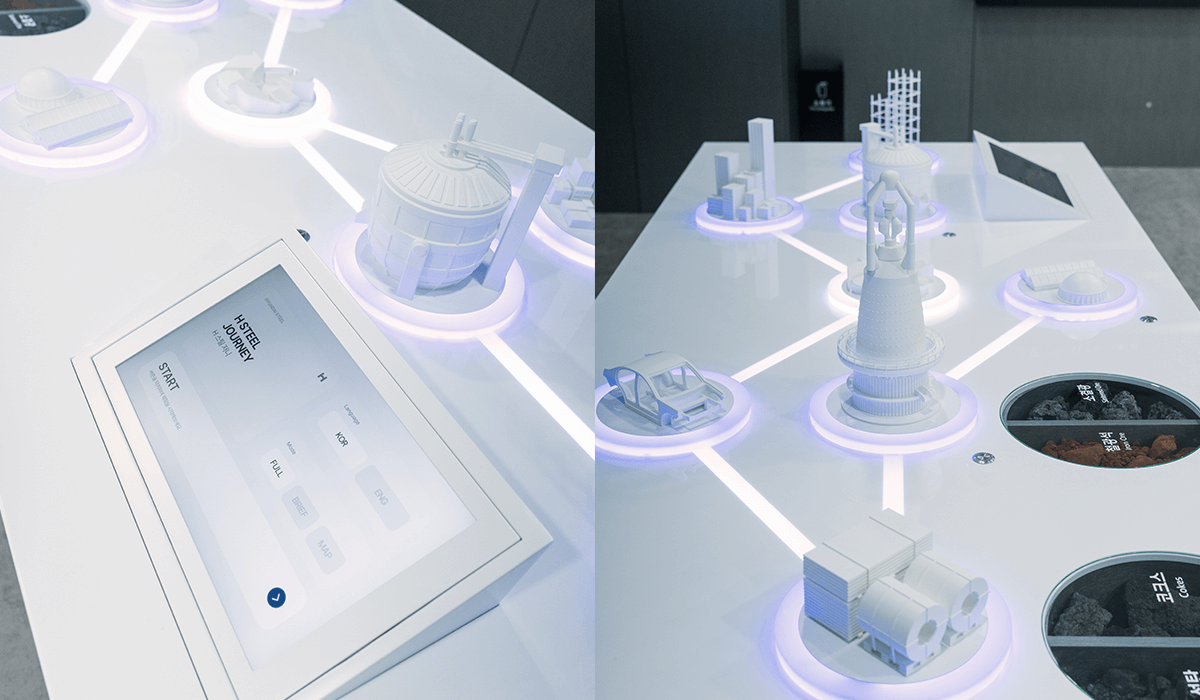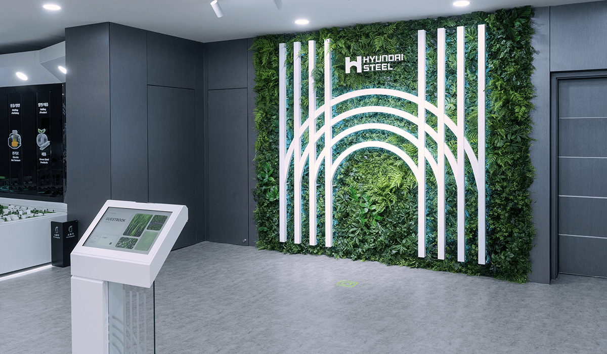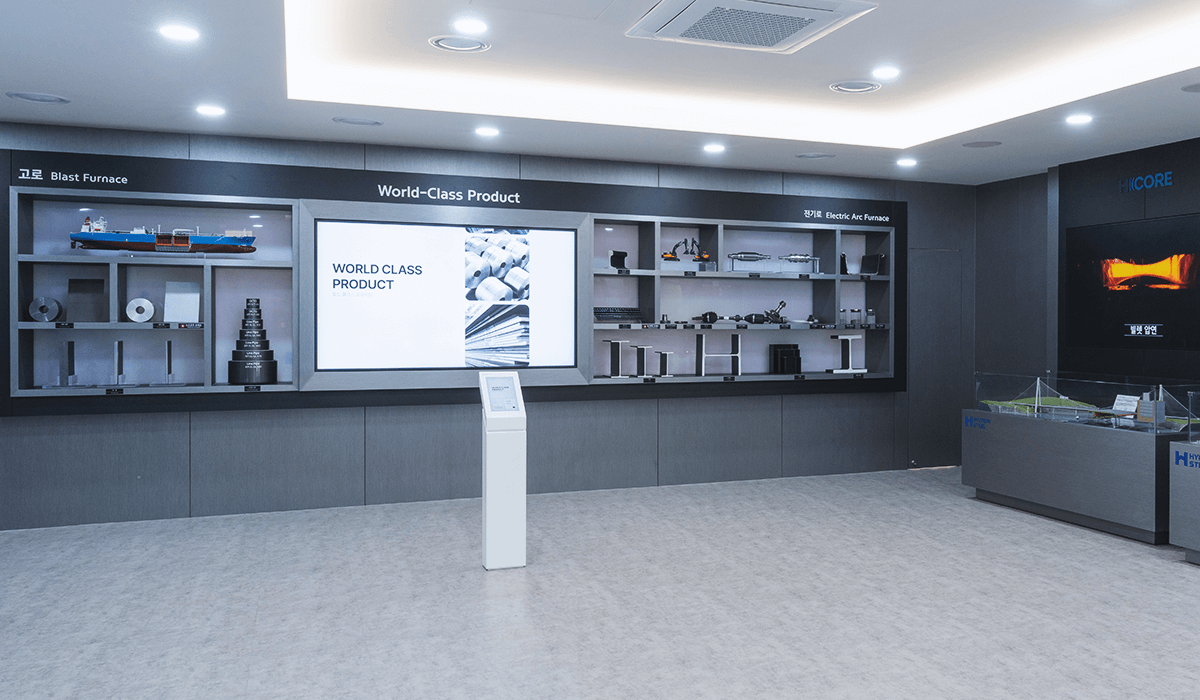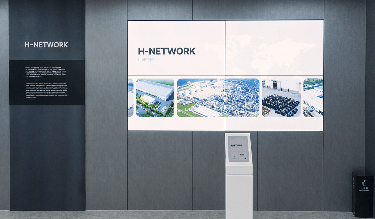 현대제철 전시관의 전체 공간 기획과 시스템 설계 및 컨텐츠 제작을 담당하였다. 입구 LED에서는 웰컴 메세지 및 방문객 환영 인사 등의 개별 메세지를 담을 수 있는 컨텐츠를 노출하고있고, 내부의 로비 LED에서는 철을 사각형 모티프로 형상화하여 끊임없이 변화하고 무한한 가능성을 담았다는 내용을 담은 현대제철 Identity 영상이 재생된다.